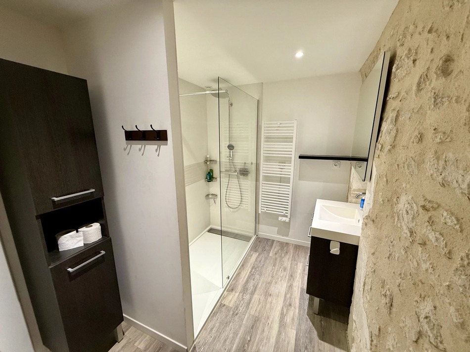 The house benefits from double-glazed PVC windows, electric shutters, mains drainage and an efficient heating system combining electric heating, pellet stove, and reversible air conditioning. With an energy efficiency rating of B, it offers an excellent balance between character and performance.