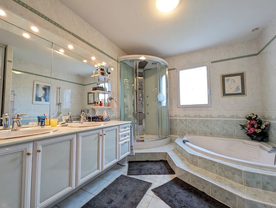 An electric gate welcomes you and opens onto a perfectly maintained garden. The house consists of a large entrance hall opening onto the bright living room with its fireplace and an open plan kitchen. From here, you can access the fabulous terrace with its BBQ area overlooking the swimming pool. Back inside, a hallway leads to three bedrooms, one of which is currently used as a dressing room and the other as an office. On this level there is also a large bathroom with shower and corner bath, as well as a separate toilet. Upstairs, a landing leads to two further bedrooms and a shower room. An internat staircase provides access to the large basement, which is divided into a spacious workshop, a laundry/boiler room, a storage area for the garden and a double garage.