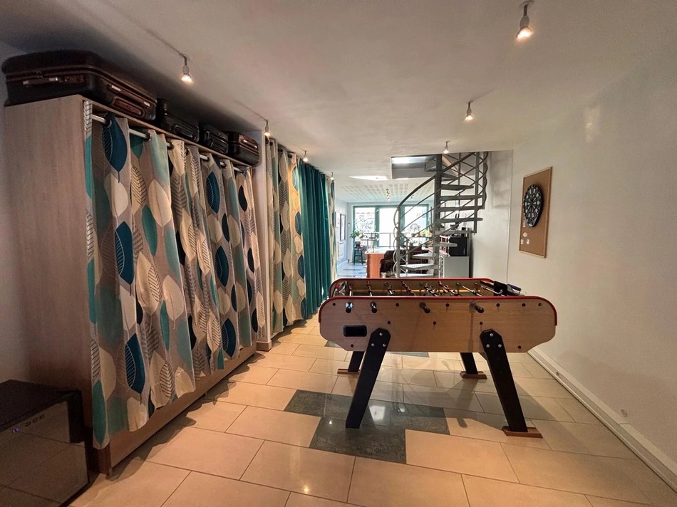 On entering the this unique house you will be impressed by the space flooded with natural light thanks to floor-to-ceiling windows doors at both ends of the room. The ground floor includes a fully-equipped reception or bar area, a large living area divided by industrial style doors.