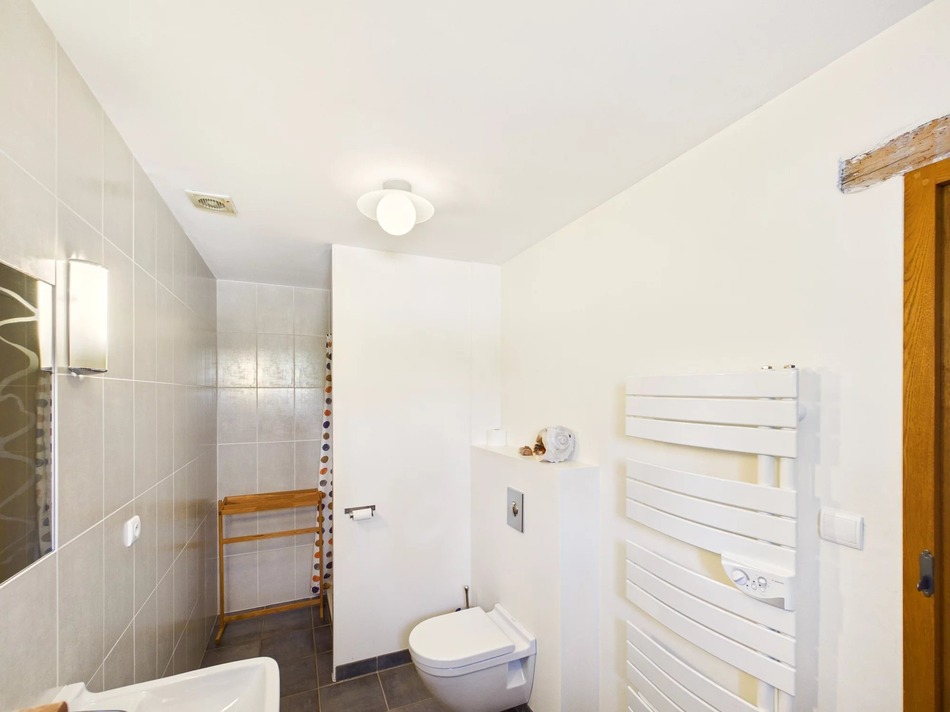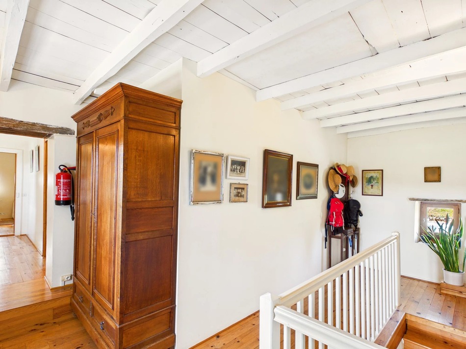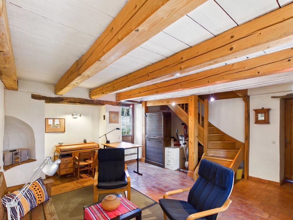 Character features add warmth and charm throughout, including exposed wooden beams and a traditional colombage (half-timbered) wall in the principal bedroom. The kitchen and bathrooms have been modernised to a high standard, blending contemporary comfort with the home’s historic character.