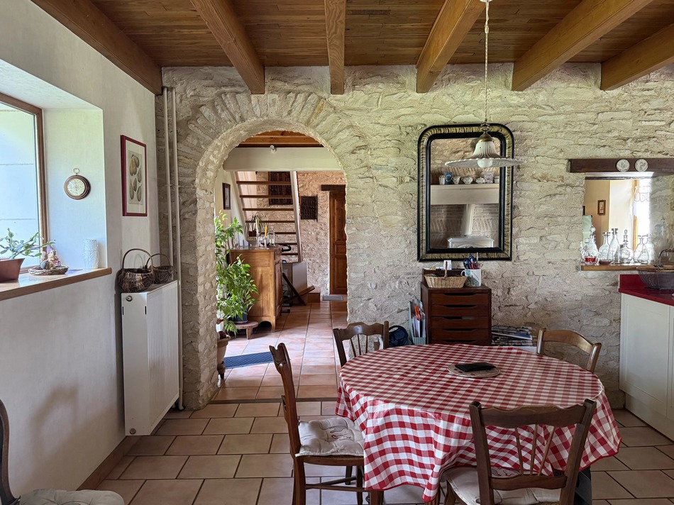 This traditional 3-bedroom stone longère consists of 170m² living space with an additional 20m² summer kitchen and is situated on 7300m² of flat and wooded grounds, offering a unique living environment.