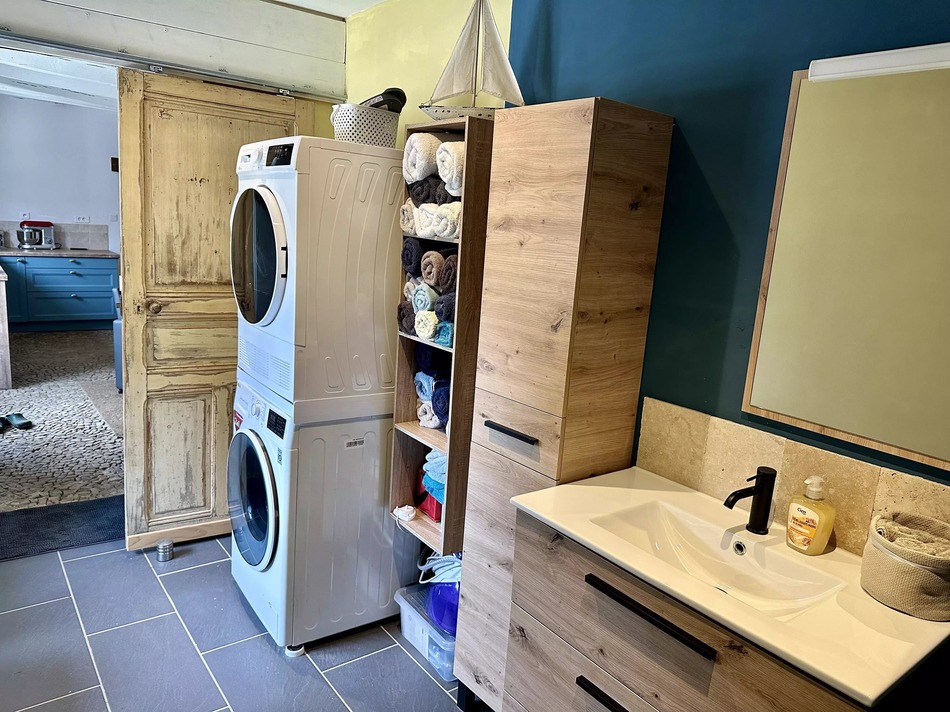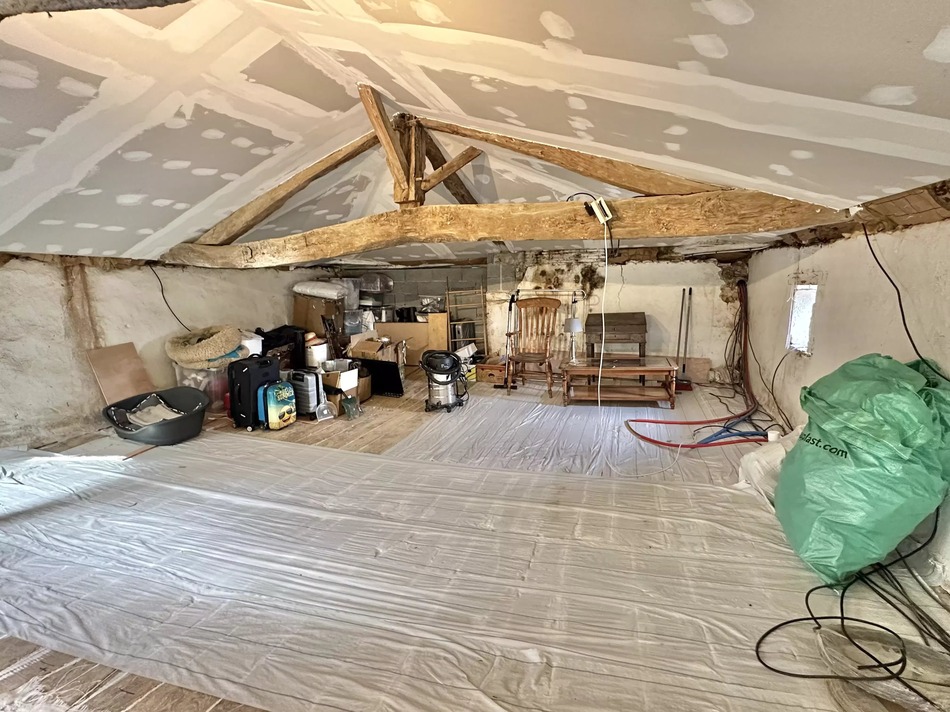 The ground floor has been fully renovated and features a beautiful living area with fireplace, creating a warm and inviting atmosphere. The kitchen is a superb blend of old and new, and like the living room, boasts magnificent coeur de demoiselle floor tiles that add character and authenticity.