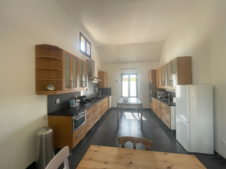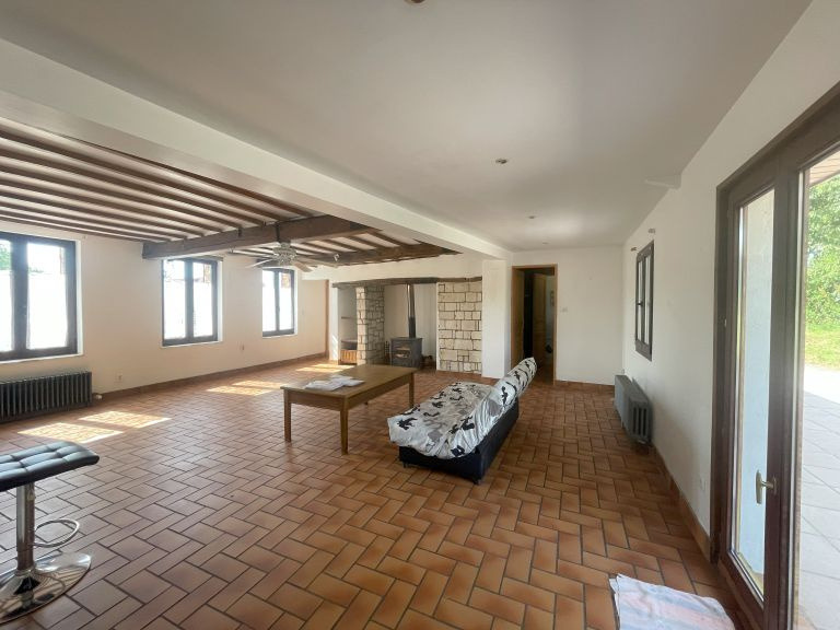 Une vaste pièce de vie de 64 m2 avec cuisine ouverte sur salon avec poele à bois, alliant convivialité et luminosité